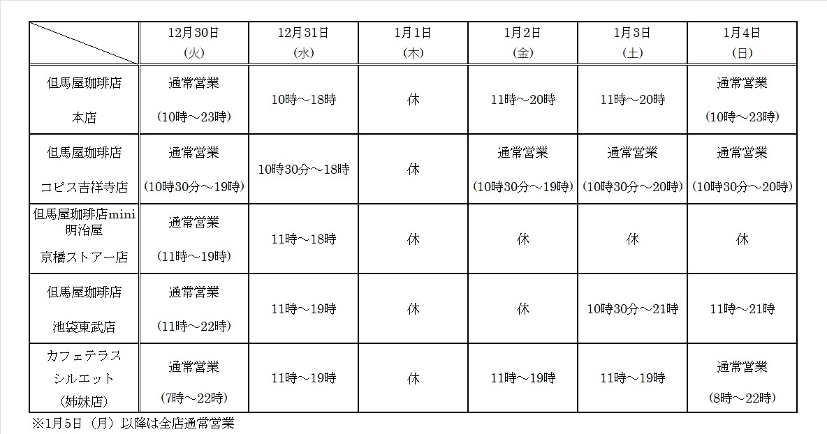 東京都からの営業時間短縮要請の延長に伴い、但馬屋珈琲店本店の2020年11月28日(土)~2021年1月11日(月)の営業時間を全日10時〜22時(ラストオーダー21:30)に変更致します。